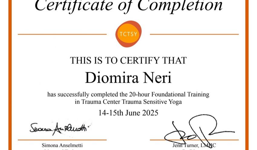 La Dott.ssa Neri ha concluso un percorso formativo introduttivo sul Trauma Sensitive Yoga, una modalità di pratica corporea pensata per chi ha vissuto esperienze traumatiche o situazioni che hanno compromesso il senso di sicurezza e di connessione con il proprio corpo.